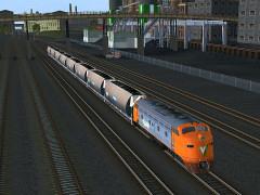 This session is for Urban IndustRail 7b. It uses default Trainz rolling stock, apart from the Australian VLine B class locomotive, and the Australian wheat, mill and coal hoppers. All these items of rolling stock are on the Download Station and will be installed automatically when the session is downloaded. The session should take about two or three hours to complete.