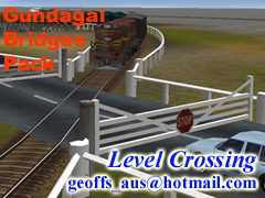 Gundagai highway/rail intersection where Hume Highway crosses rails at the end of the twin bridges. Road and rails intersect at 45 degrees with animated gates. Part of the Gundagai Twin Bridges pack. Installes under Australia as GBK level x-ing.