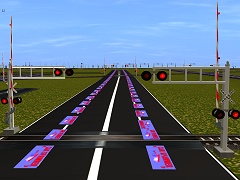 Use with 4 lane Road <kuid2:95230:100195:3>, Updated original by BNSF50 Grade Crossing Overhead US 4 Lanes 1 Track with protypically animated gates and lights. CR-for use with the Custom Invisible Roads.