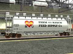 ACF 6 Bay Cylindrical Covered Hopper, lettered for SHPX, version 3, with Farm and Ranch Feed Supply logo, with ARN. Loads sand, clay, salt, grain and granular plastic.