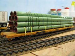 TTX owns numerous 89-ft, 70- or 110-ton, general purpose flat cars. Their simple design belies their capability to carry numerous types of cargos, particularly large, bulky, and heavy items, including pipe and other primary steel products (and occasionally old rail equipment for museums or railcars damaged in wrecks). To facilitate shipments, many of the 110-ton cars are equipped with a system of floor deck holes, which permit the easy installation of risers, bunks, and other attachment devices used to secure loads. Additionally, several thousand cars are specially equipped to handle pipe, and the cars include Vibration Isolation Devices (VID's) and lading strap anchors. These cars (and many others) also feature stake pockets and web strap winches.