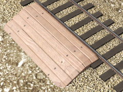 Side boards for a 10' wood crossing. Non-interactive (does not stop traffic or connect to road splines). Will snap to track for proper placement.
