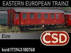 Bim series 2nd class trailer car owned by Czechoslovak State Railways CSD, former Civ-34 trailer car manufactured in 1934 for German Railways DRG, taken over by CSD after 1945 and used in local passenger trains until late 1970s. Script Qcyk85, 3d kilanziom, photos kilanziom. Model suitable for TRS2004+.