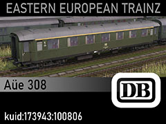 Aue 308 series 1st class passenger coach owned by West German Railways DB, originally manufactured in 1935 by Wegmann for German Railways DRG as AB4u-35 type No 11 619 A4ue, taken over by DB after 1945, remaining in regular service until 1982. Model presents late 1970s state and lettering. 3d by kilanziom, photos by kilanziom, textures by kilanziom, script by Qcyk85. Model suitable for TRS2004+