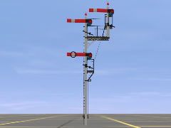 Based on a Somerset & Dorset Railway lower quadrant semaphore signal at Evercreech North junction. Left branch home with 4' arms, and additional left loop or siding arm with speed limit, on double rail post. Mesh and textures by chrisaw using original files produced by Bloodnok, my thanks to him for agreeing to this release. His license applies. Use targets (left to right) L2-L1-straight