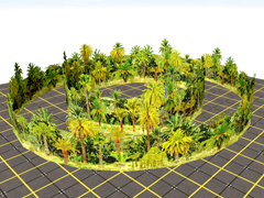 Two backgrounds or backdrops with palm trees and vegetation in rounded or circular shapes of 30 and 50m radius and 20 and 25m high, with vegetation typical of Mediterranean and other temperate or semi-desert climate zones. Version 2. The backgrounds or backdrops should not be used in the foreground or very close to the tracks.
