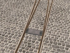 Metric gauge railway switches, embedded in the ground for tracks on streets (tramways) or industrial areas, classic version with internal electric motor, A, 40cm wide.
