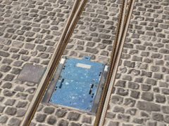 Metric gauge railway switches, embedded in the ground for tracks on streets (tramways) or industrial areas, version A, con motor eléctrico de cambio interno, de estilo moderno y actual.