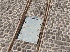 Metric gauge railway switches, embedded in the ground for tracks on streets (tramways) or industrial areas, version B, con motor eléctrico de cambio interno, de estilo moderno y actual.
