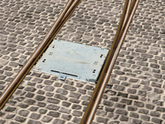 1435mm gauge railway switches, embedded in the ground for tracks on streets (tramways) or industrial areas, version B, con motor eléctrico de cambio interno, de estilo moderno y actual.