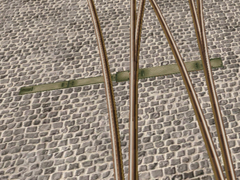 1668mm gauge railway switches, embedded in the ground for tracks on streets (tramways) or industrial areas, manual version with two metal extension modules (2M), without a track switch lever (-), for crossing with rails in several consecutive switches. It is 2 cm deeper into the ground to clearly see the intersection with other rails.