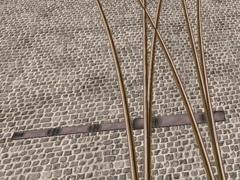 1668mm gauge railway switches, embedded in the ground for tracks on streets (tramways) or industrial areas, manual version with three metal extension modules (3M), without a track switch lever (-), for crossing with rails in several consecutive switches. It is 2 cm deeper into the ground to clearly see the intersection with other rails.