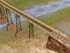 Iron bridge for 610mm or 2 feet track, with a span of 10m, with stone abutments (12m), and two pedestrian walkways. Support or central pillar of iron, on a stone cutwater. Central height of the bridge 19m. Version 4B for TANE and above.