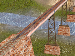 Iron bridge for a 610mm or two feet gauge track, with a span of 20m, and with stone abutments 12m long and 19m deep, as start and end, with central iron supports or pillars with a stone base. Bridge height 19m. With anti-derailment rail guard. Versión 5A, pink bridge.