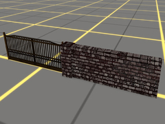 Closed iron gate for coal storage area or yard, 6m long, 2m high with 7m long fixed wall, to one side of the door.