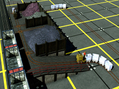Elevated coal bunker with three types of coal arranged in 3 piles, at the level of classic coal load wagons. Contains 18 inches (45,72cm) wide track circuit that admits 18 inches material to circulate and maneuver, with two outlets or inlets for rolling stock on one side. It does not support uploading and downloading, it is not functional, it is a static object. The 4 turntables for 18in cars are not functional as well as its 4 short attached tracks, they are only decorative. Version 7