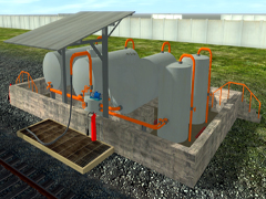 Group 5 fuel tanks, static non-functional. Version 01, Gray 1. With concrete container for fuel spills. Capacity or virtual volume of the tanks: 3 horizontal tanks of 14.78m3 x 3 = 44.35 m3; 2 vertical tanks of 5.37 m3 x 2 = 10.75 m3; Total capacity: 55.10 m3 or 14555 US gal