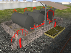 Group 5 fuel tanks, static non-functional. Version 02, Gray 2. With concrete container for fuel spills. Capacity or virtual volume of the tanks: 3 horizontal tanks of 14.78m3 x 3 = 44.35 m3; 2 vertical tanks of 5.37 m3 x 2 = 10.75 m3; Total capacity: 55.10 m3 or 14555 US gal