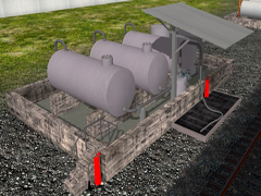 Group 5 fuel tanks, static non-functional. Version 03, Gray 3. With concrete container for fuel spills. Capacity or virtual volume of the tanks: 3 horizontal tanks of 14.78m3 x 3 = 44.35 m3; 2 vertical tanks of 5.37 m3 x 2 = 10.75 m3; Total capacity: 55.10 m3 or 14555 US gal