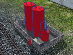 Group 2 fuel tanks, static non-functional. Version 11A, Red. With concrete container for fuel spills. Capacity or virtual volume of tanks: 2 vertical tanks of 7.64 m3 x 2 = 15.28 m3 or 4036 US gal