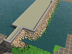 Port dock or quay on one side and breakwater on the other side, with a 60m wide and 20m high, light gray asphalt floor. Version 7. It is a SPLINE of 3 parts, beginning, middle or repetition zone and end.