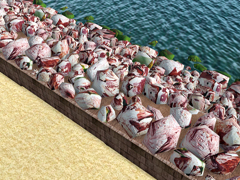 Breakwater with rock wave breakers on one side and two-part stepped stone wall on the other side, for the protection of port areas. Side with rocks with a height of 20m and side of the wall with the same height of the rock floor 20m and with rocks on the upper floor of the wall. Version 1d. It is a SPLINE of 3 parts, simple beginning, middle zone (4 lods) or repetition and simple end.