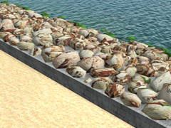 Breakwater with rock wave breakers on one side and two-part stepped stone wall on the other side, for the protection of port areas. Side with rocks with a height of 20m and side of the wall with the same height of the rock floor 20m and with rocks on the upper floor of the wall. Version 7d. It is a SPLINE of 3 parts, simple beginning, middle zone (4 lods) or repetition and simple end.