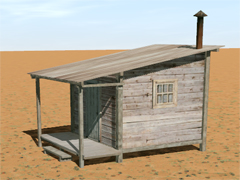 Small wooden house, old west style, with chimney and smoke, no night mode. Dimensions: 3m x 3m. Version 0C