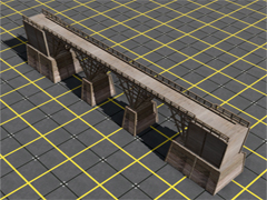 Wooden bridge with some iron parts in the shape of Y, in the style of the old west. Composed of 4 parts: right abutment with small bridge span, left abutment with small bridge span, and 2 bridge spans with support or central pillar. Dimensions: 46m long, 4m wide and 16m high. It has 4 meshes or lods. Version 7Y