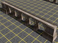 Wooden bridge with some iron parts in the shape of Y, in the style of the old west. Composed of 6 parts: right abutment with small bridge span, left abutment with small bridge span, and 4 bridge spans with support or central pillar. Dimensions: 76m long, 4m wide and 16m high. It has 4 meshes or lods. Version 9Y