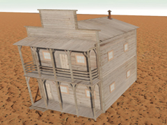 Two-story, old-west-style wooden house with stairway and balcony, with chimney and smoke, it has no night mode. Dimensions: 6m x 6m. Version 8C