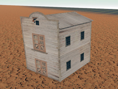 Two-story, old-west-style wooden shed with stairway, no night mode. Dimensions: 6m x 6m. Version 8J