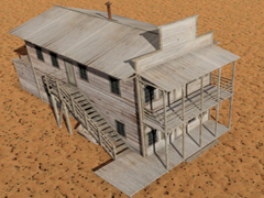 Two-story, old-west-style wooden house with stairway and balcony, with chimney and smoke, it has no night mode. Dimensions: 6m x 12m. Version 10H1
