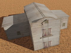 Two-story, old-west-style wooden Warehouse with 3 attached sheds, with pulley and rope with hook, for loading goods. No night mode. Dimensions: 6m x 12m. Version 10N1