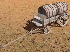 Old west style wooden wagon for transporting goods, loaded with two medium wooden barrels. Barrel dimensions: 1.46m long, capacity 7922 liters or 2093 US gallons.