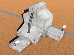 Grain loading, made of wood, with grain elevator with open entrance doors, old west style. Dimensions: 24m high, 26m wide and 30m long. It has 2 chimneys with smoke. It is not interactive or functional, it has no night mode. Version O1