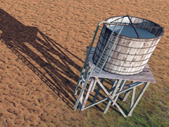 Water tower made of wood, in the style of the old west. Dimensions: 5m wide, 5m long and 10m high and with a storage capacity of 186m3. It is not functional or interactive. Version (3nC) without top cover, in which you can see the water.