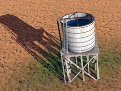 Water tower made of wood, in the style of the old west. Dimensions: 5m wide, 5m long and 10m high and with a storage capacity of 186m3. It is not functional or interactive. Version (4nC) without top cover, in which you can see the water.