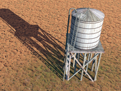 Water tower made of wood, in the style of the old west. Dimensions: 5m wide, 5m long and 10m high and with a storage capacity of 186m3. It is not functional or interactive. Version (4C) with top cover, you can't see the water.