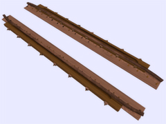 It is a track object: To make railway crossings (diamond junction or diamond crossing) at the same level. Length 3.2m, rail gauge 1067mm, with 8 bolts with union screws from the rail to the check rail (model B) every 40cm. Version or finish 2. For straight track and level with the ground. With spikes on the checkrails. Rail crossing designed for rail 30kg per meter, approximately 60.5 pounds per yard, suitable for medium rail. Rail 12 cm high. New version with the addition of the ''follow-gradient 1'' tag, to adapt to the inclinations of the railway track.