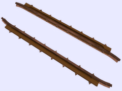 It is a track object: To make railway crossings (diamond junction or diamond crossing) at the same level. Length 3.2m, rail gauge 1000mm, with 8 bolts with union screws from the rail to the check rail (model B) every 40cm. Version or finish 2. For straight track and level with the ground. No spikes on the checkrails. Rail crossing designed for rail 30kg per meter, approximately 60.5 pounds per yard, suitable for medium rail. Rail 12 cm high. New version with the addition of the ''follow-gradient 1'' tag, to adapt to the inclinations of the railway track.