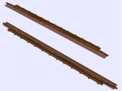 It is a track object: To make railway crossings (diamond junction or diamond crossing) at the same level. Length 5m, rail gauge 1520mm, with 13 bolts with union screws from the rail to the check rail (model B) every 40cm. Non-symmetric check rails at 45º. Version or finish 2. For straight track and level with the ground. Rail crossing designed for UIC rail 60kg per meter, approximately 121 pounds per yard, not suitable for light rail. Rail 16 cm high. New version with the addition of the ''follow-gradient 1'' tag, to adapt to the inclinations of the railway track.