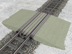 It is a track object. Level crossing made of light-colored asphalt, with 6 additional rails for rails track protection, for metric narrow gauge track, 3.5m wide, for one traffic lane. Version B