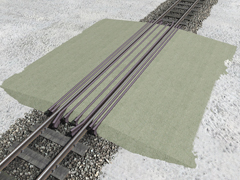 It is a track object. Level crossing made of light-colored asphalt, with 6 additional rails for rails track protection, for metric narrow gauge track, 7m wide, for one traffic lane. Version B