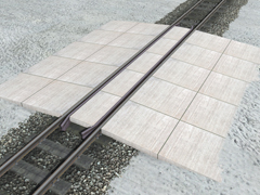 It is a track object. Level crossing made of scratched slabs concrete, for metric narrow gauge track, 7m wide, for one traffic lane. Version 2C