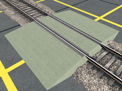 It is a track object. Level crossing made of light-colored asphalt, with 8 additional metal strips for rails track protection, for 1668mm gauge track, 7m wide, for one traffic lane. Version A.