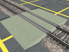 It is a track object. Level crossing made of light-colored asphalt, with 6 additional rails for rails track protection, for 1668mm gauge track, 7m wide, for one traffic lane. Version B