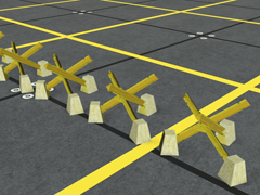 Military equipment for anti-tank defence. Czech hedgehog is an anti-tank defence obstacle made of angled metal bars, bolted and/or welded. Version with nuts and bolts (Nb) and round hitch (R), fixed to the ground by concrete blocks (C) and rusty looking, version 3. 4 Lods. Approximate version to the real one. It is a SPLINE.