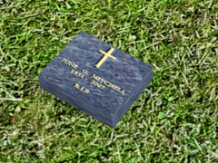 Graves for a British and American style cemetery (B&A). Graves with stone or marble headstones. Ground level tombstone, horizontal and flat headstones or lawn-level markers (·H), in a rectangular shape with a slab thickness of approximately 4 inches or 10 cm. They symbolize simplicity and a modest focus on the memory of the deceased. Clean, new or almost new tombstone (N.). Version 01.