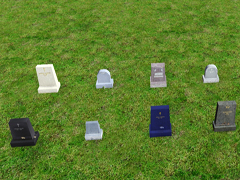 Graves for a British and American (B&A) style cemetery. Tombs with stone or marble tombstones of modern style, current or almost new (N.), in varied groups (Gr) and with different quantities, the tombstones are in vertical position (V) on the ground. Version 6 with 8 Tombs.